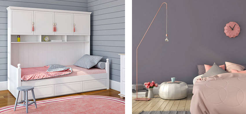 紫色總是給人一股優(yōu)雅浪漫的感覺,適度以暖木棕地板或柜體平衡,呈現(xiàn)出寧靜素雅的空間感,使用在臥房中能衍生放松適意的心情;以粉灰色筑起的臥房中,以原木色和白色調(diào)和能呈現(xiàn)甜美清新感,若加入灰黑色點綴則跳脫稚嫩,不過于甜膩,有股大人的成熟感。