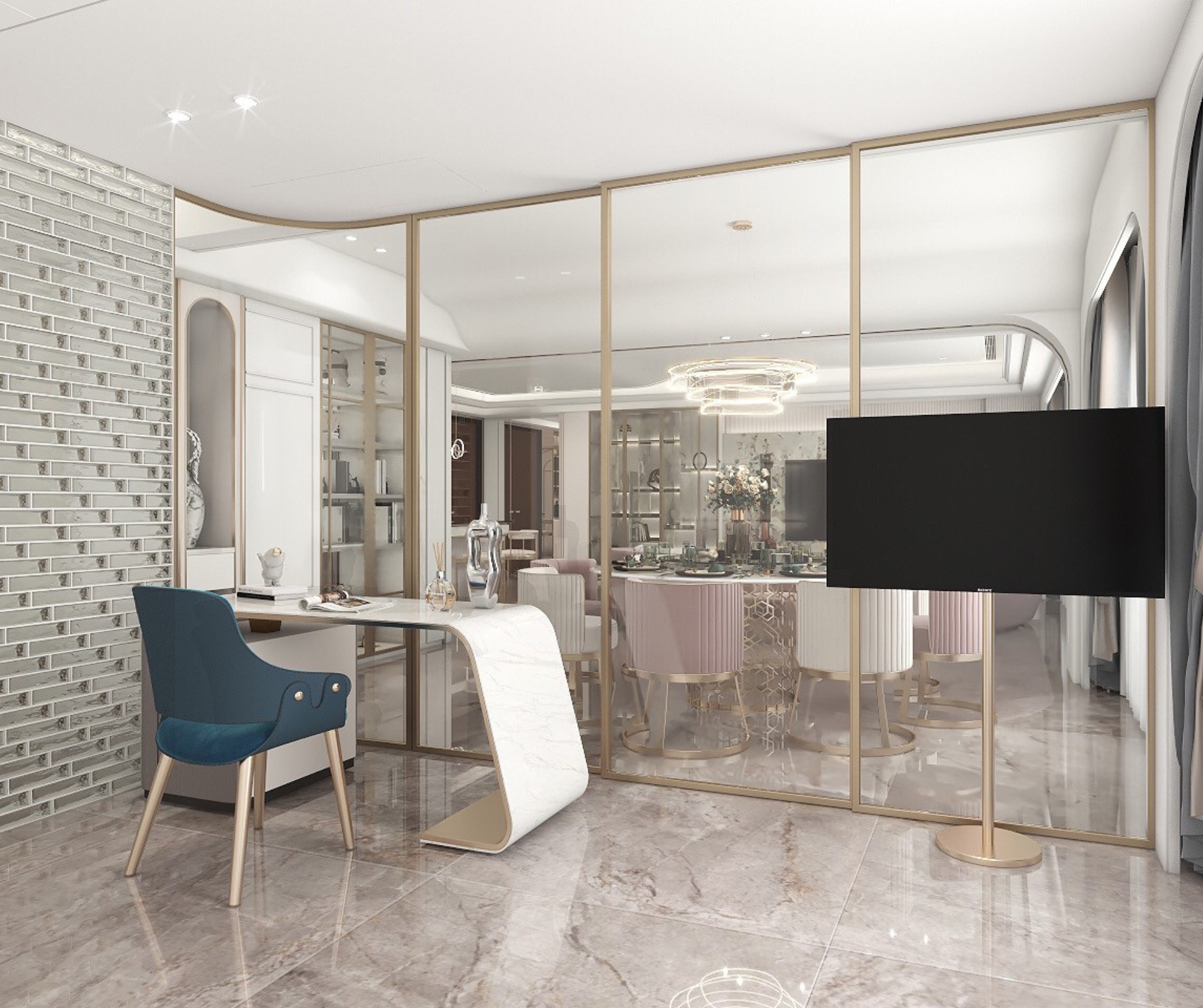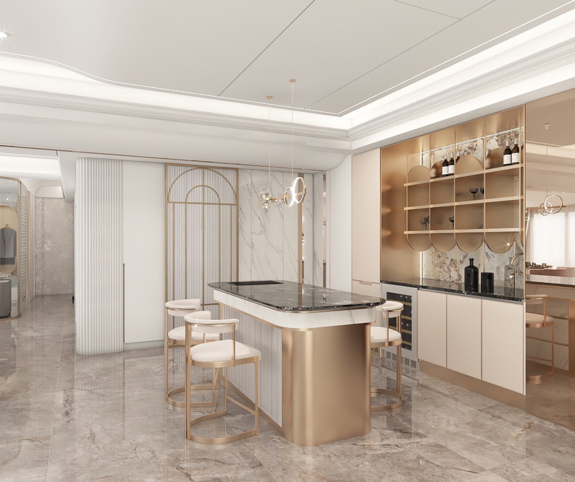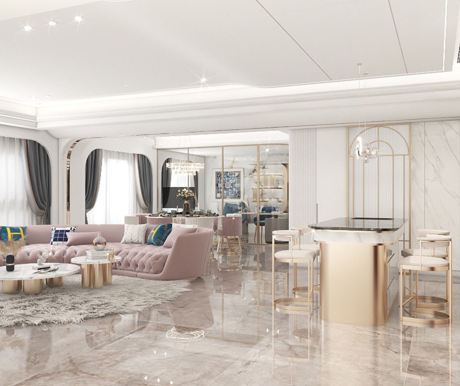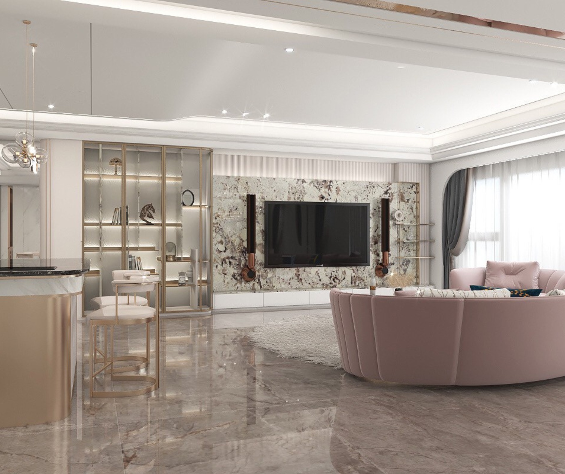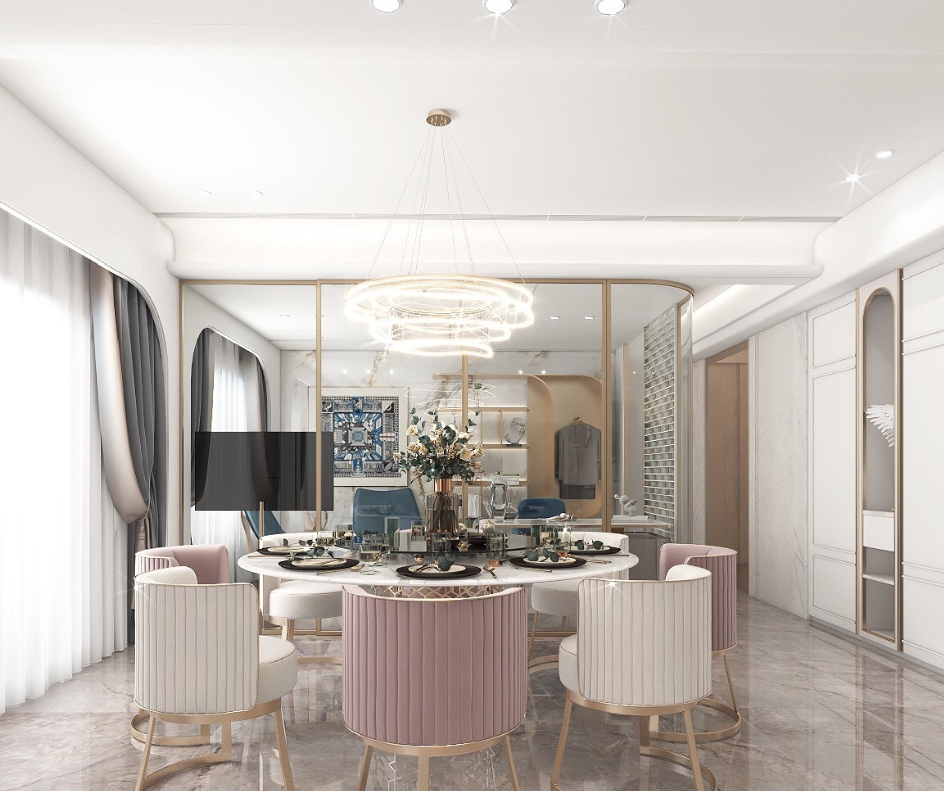 輕奢法式浪漫風格的家裝強調(diào)淡雅的色彩,如淡粉、淡藍、米色和灰色。在這個案例中,客廳和餐廳的墻壁采用了淺粉色和灰色的調(diào)配,營造出溫馨而寧靜的氛圍。家具和裝飾品則選用了金色、銅色和銀色的裝飾,為空間增添了輕奢感。