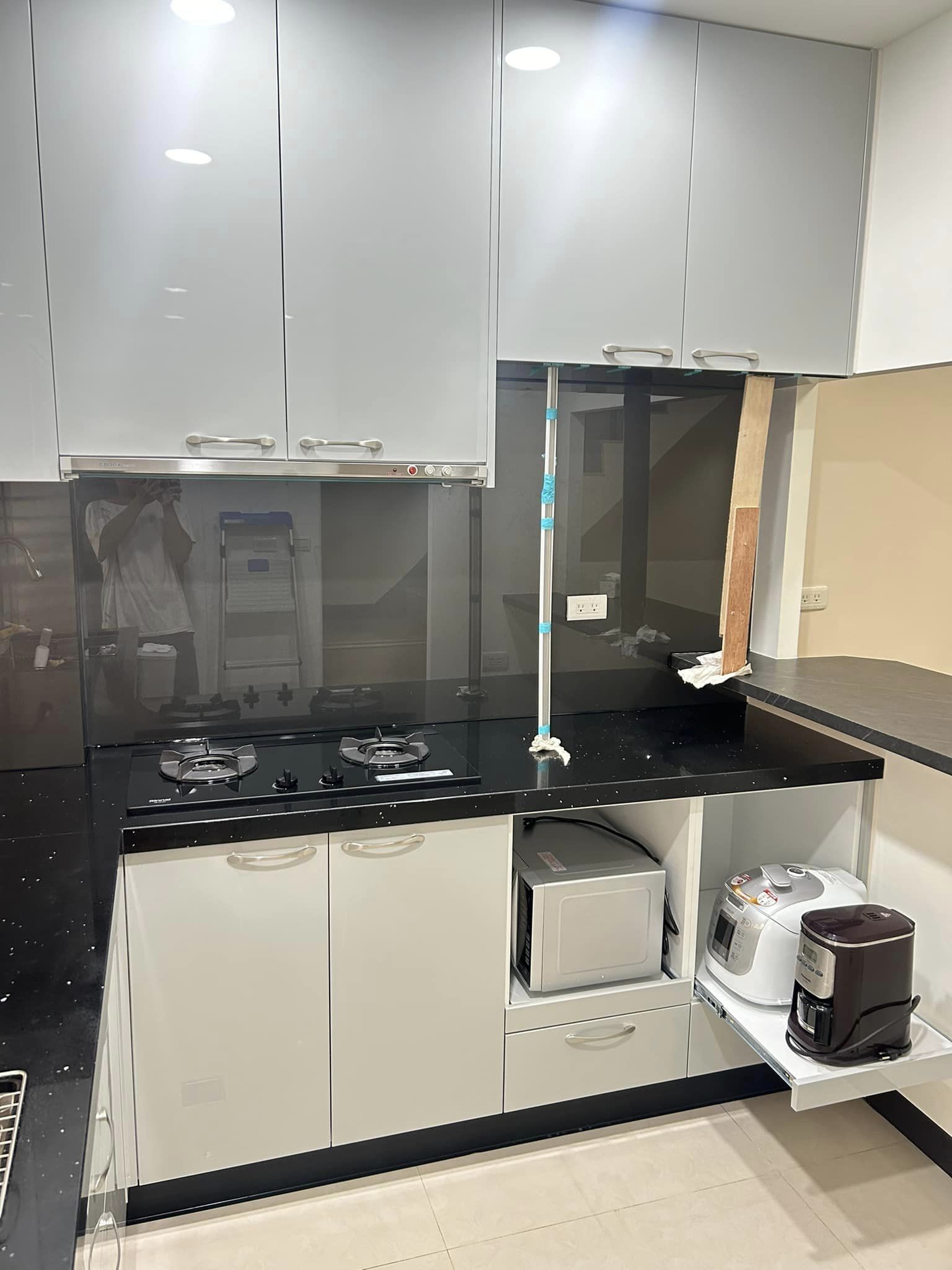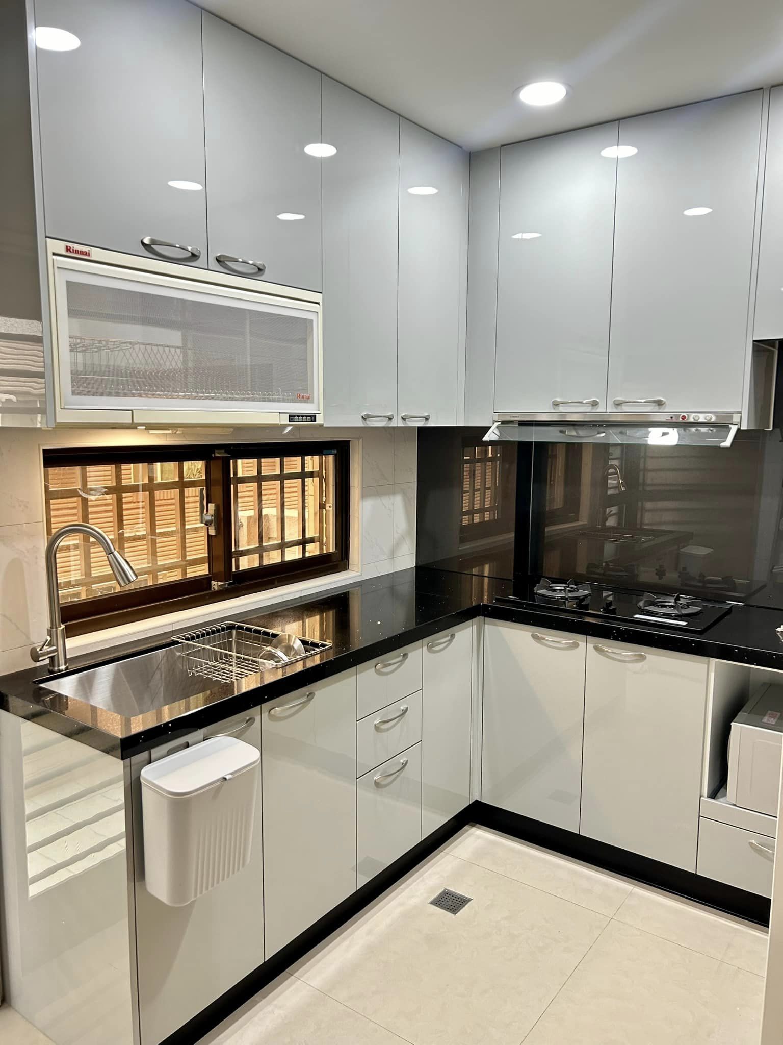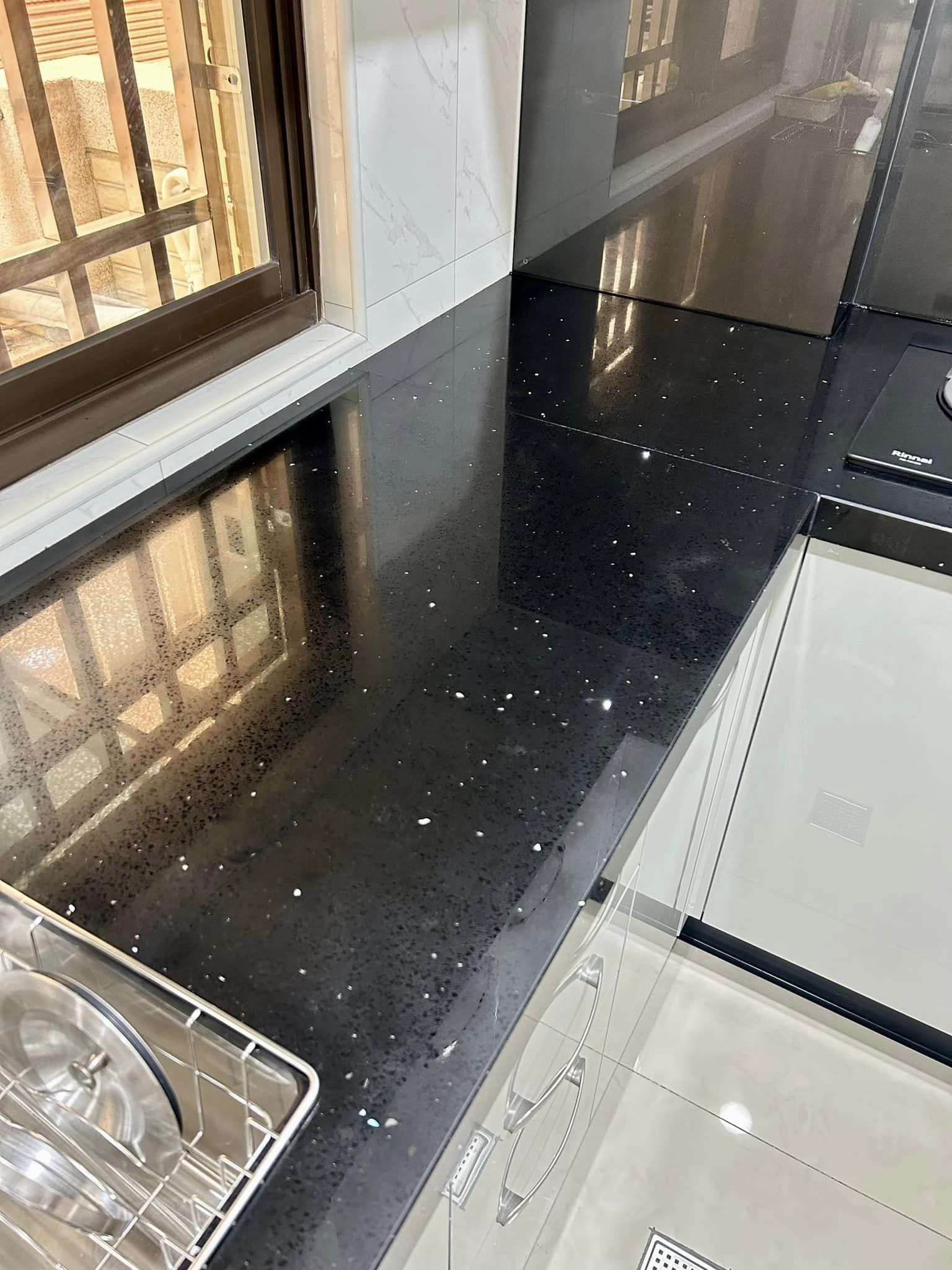 為了增加對比度和深度,我們選擇了黑色廚柜臺面。這些臺面不僅美觀,還耐用且易于清潔,抵抗磨損和污漬,使整個廚房看起來更加引人注目。