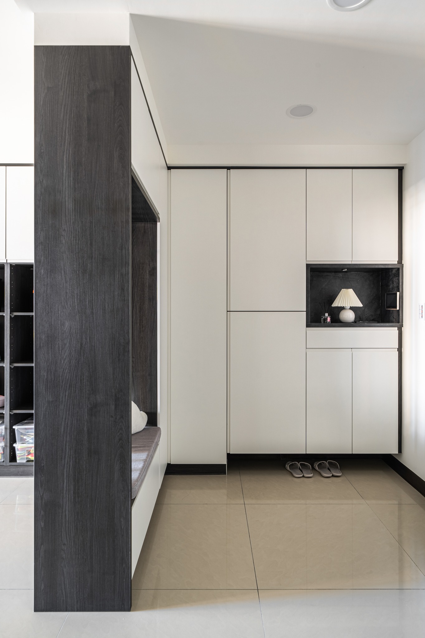 進(jìn)門即見(jiàn)的玄關(guān)區(qū)域是整個(gè)家居的第一印象,為了使空間更具現(xiàn)代感,我們采用了現(xiàn)代風(fēng)格的設(shè)計(jì)理念。特別設(shè)置了玄關(guān)落塵區(qū),通過(guò)巧妙地運(yùn)用穿鞋椅搭配格柵條,不僅實(shí)現(xiàn)了鞋履的整齊收納,還讓自然光線可直接穿透至玄關(guān)區(qū)域,保持了空間的通透明亮,同時(shí)也不會(huì)影響光源的投射效果。