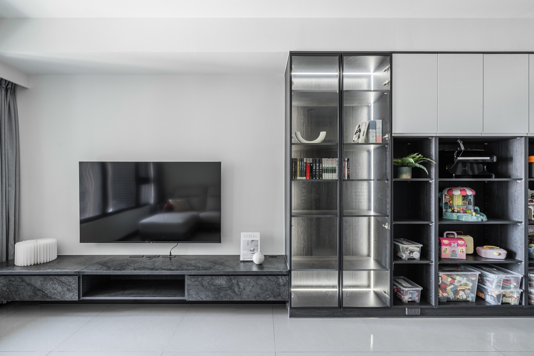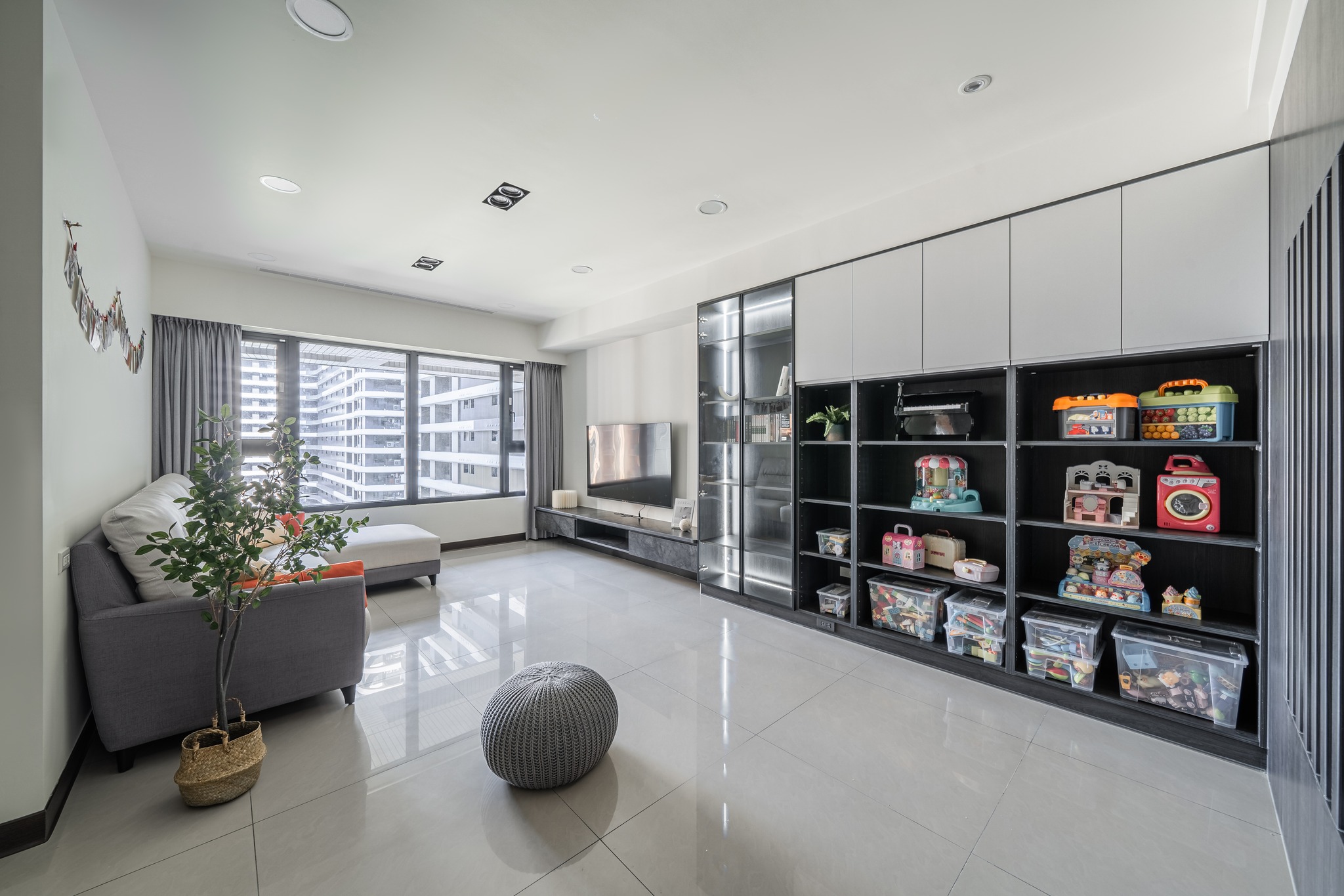在家庭中,收納常常是一個(gè)挑戰(zhàn),尤其是有孩子的家庭。為了解決這個(gè)問(wèn)題,我們?cè)谛P(guān)區(qū)域設(shè)置了開(kāi)放式的層架區(qū)。這個(gè)區(qū)域不僅用來(lái)收納孩子心愛(ài)的玩具,還設(shè)有游戲墊,成為孩子的專屬游戲區(qū)。層架設(shè)計(jì)既滿足了收納的需求,又為孩子提供了一個(gè)自由發(fā)揮的空間,使整個(gè)家庭充滿活力與溫馨。