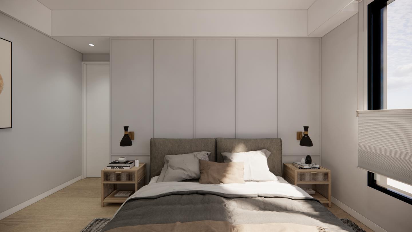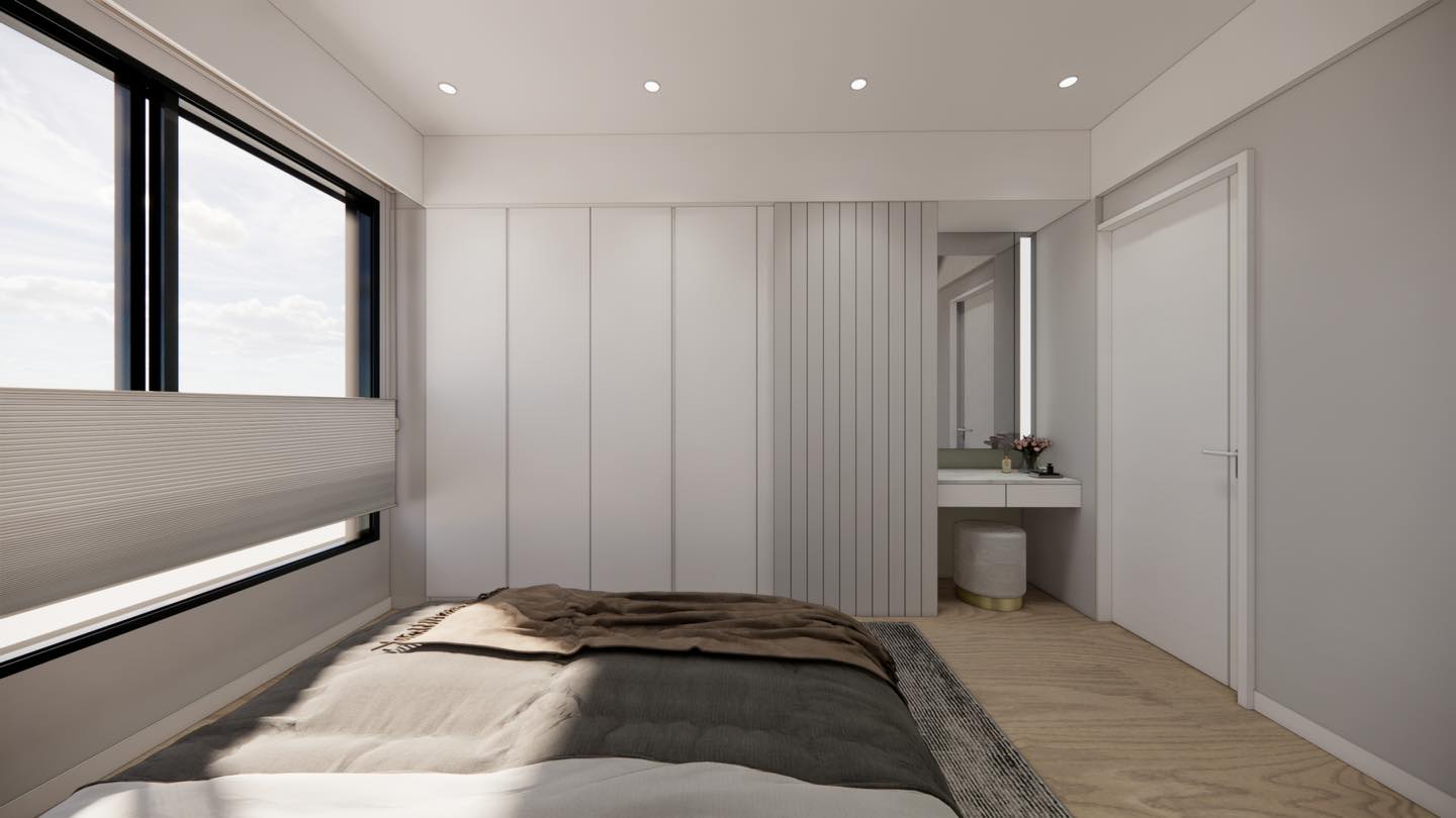 主臥室的梳妝區(qū)巧妙地結合了系統(tǒng)化的化妝柜和衣柜,通過寬、窄版縱向線條的搭配,打造出層次感十足的設計。這個空間不僅實用,還兼具藝術性。