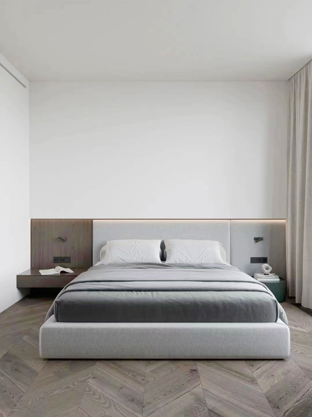 臥室則是一個溫暖舒適的私密空間,原木地板與灰色家具相得益彰,給人一種自然清新的感覺。