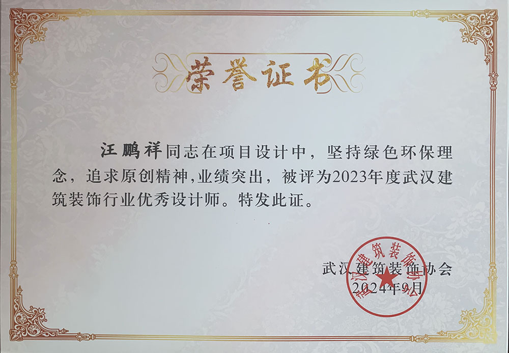2023年 - 評為武漢建筑裝飾行業(yè)優(yōu)秀設(shè)計(jì)師