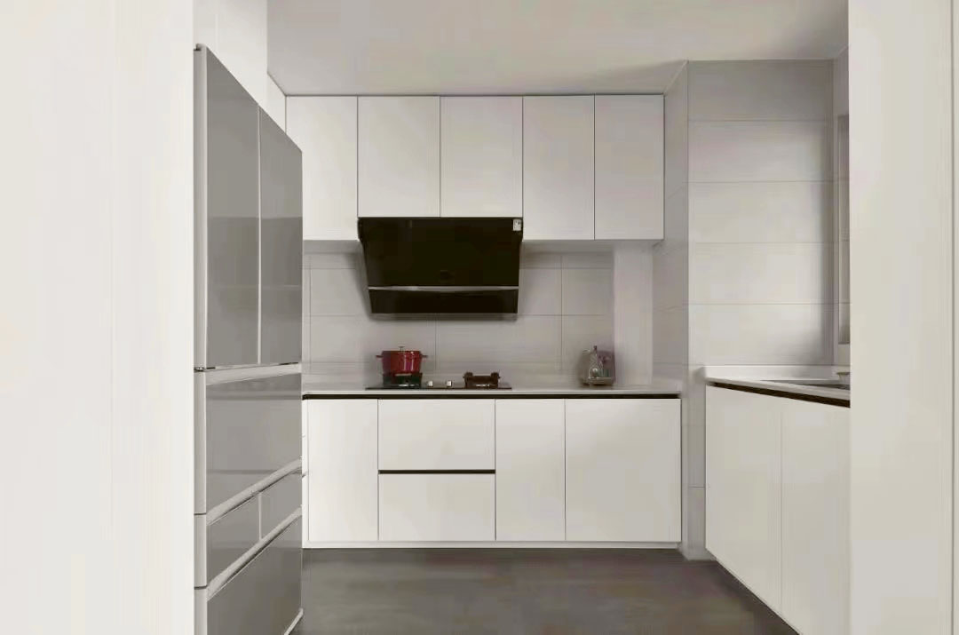 開放式的U字型廚房是這個家裝設(shè)計(jì)的亮點(diǎn)之一。白色櫥柜與深灰色地面形成鮮明對比,現(xiàn)代感十足。